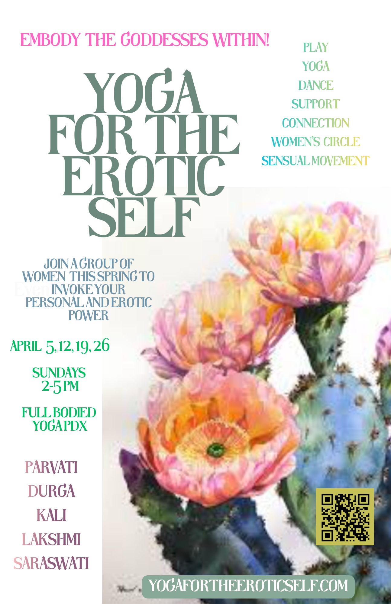 Across 4 weeks together, we’ll learn about 5 Goddesses from the Yoga lineage. We’ll explore their stories, strengths, shadow aspects, mantras, and embody their energy to deepen our relationship with The Erotic Self.